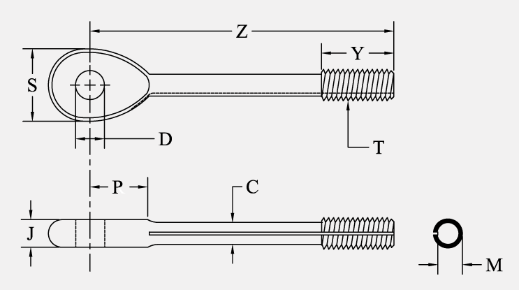 Dash No. RH | Dash No. LH | Wire Rope Dia.Ref | Min. Breaking Strength | Thread T UNF-3A | C +.006 -.000 | D +.002 -.000 Dia. | J ±.005 | M Max | M Min | S Max | Y ±.047 | Z +.031 -.051 |